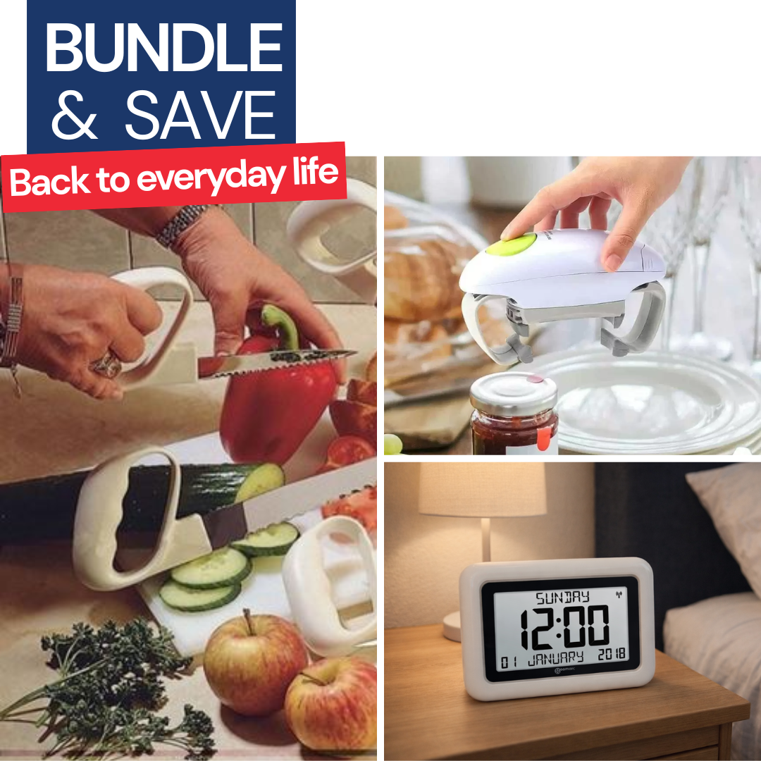 Make everyday tasks easier at home. this bundle includes a comfort grip knife, a one touch jar opener, and a large display digital clock to support safer meal prep, easier opening, and clearer time and routine tracking. available online or in our Bentleig