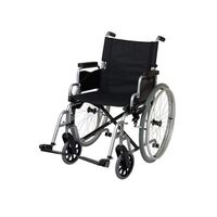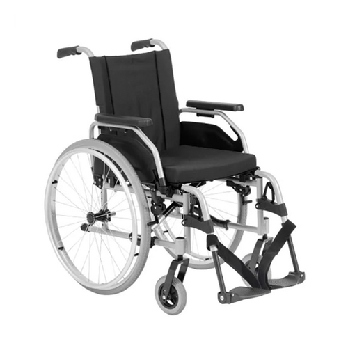 A manual wheelchair with a folding profiled aluminum pipe frame. It is self-propelled using a rear-wheel drive action and is suitable for adults. The wheelchair is available in various seat widths and depths with an adjustable back height.