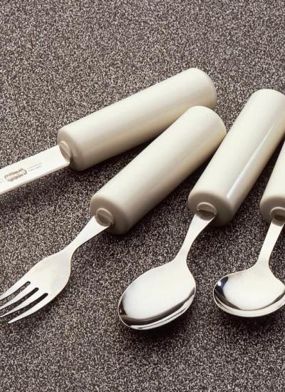 This very popular cutlery combines high quality stainless steel utensils that are mounted into lightweight built up plastic handle that are ideal for those with a weak or painful grip. The built up handles are cylindrical in shape to further aid with gripping and use. Where the handle joins the metal, the knife is fully sealed, so there are no cracks or gaps that could otherwise trap moisture, dirt or bacteria.