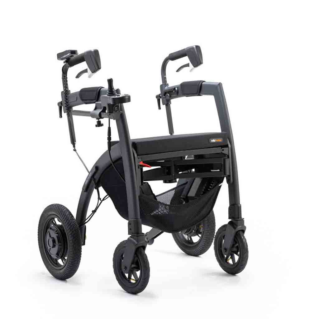 Switches seamlessly between the three mobility options: rollator, transit chair for being pushed by a friend, or drive yourself with the electric controls.