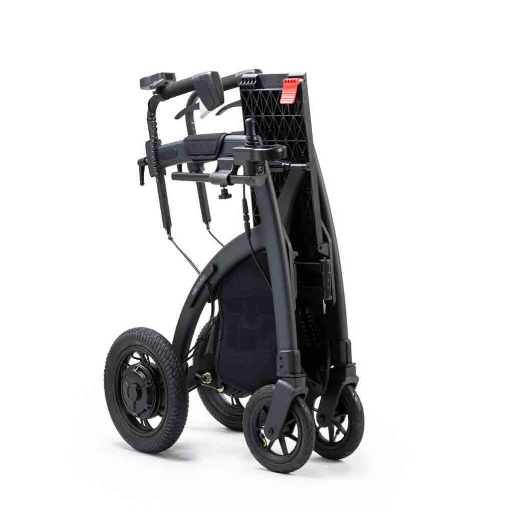 Meets NZ and AUS standards as both a walker, transit wheelchair and electric wheelchair (we don't know of any other option that meets all three). Independent driving with joystick. Push assist - great for uphill. Easy foldability that allows compact transportation. Turns on the spot even in narrow spaces. Low-vibration air tyres. Go the distance walking, then roll when you want a rest.