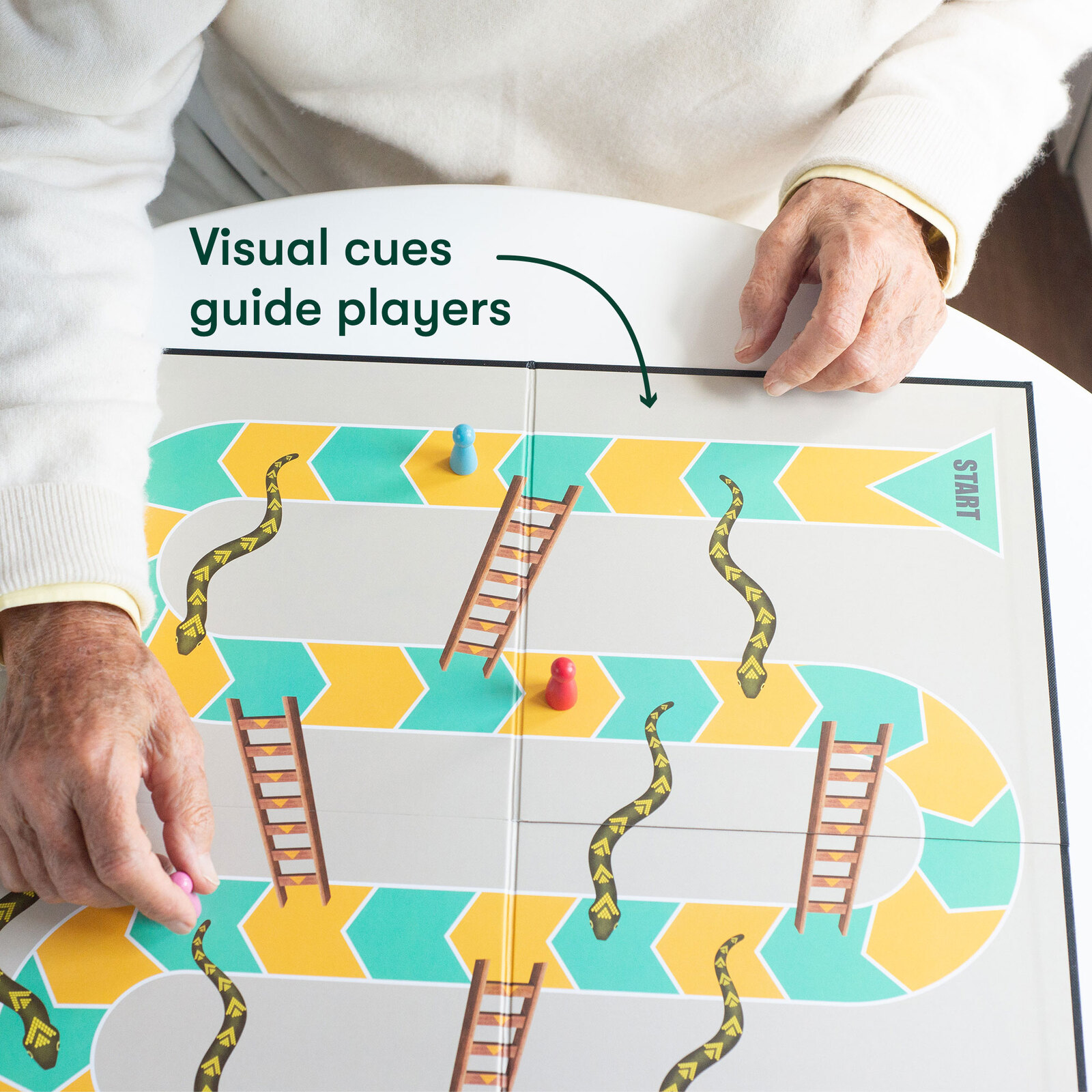 Every detail of this product has been carefully considered and researched alongside people in the mid-stages of dementia. The paired back design of the board combined with high color contrast and guiding elements provides a clear journey around the board for people with visual and cognitive impairments, meaning less stress and more fun! Additionally, we have ensured the time to completion is optimum for focus and engagement. Large numbered cards provide an easy-to-handle alternative to dice for players with dexterity and visibility difficulties.